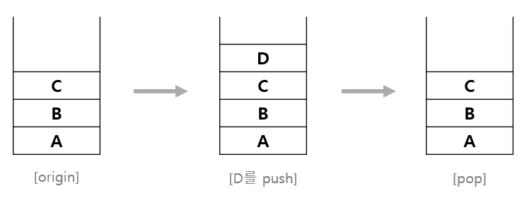스택은 기본적으로 데이터를 삽입할 수 있는 push와 스택에서 데이터 하나를 빼내는 pop으로 동작한다.