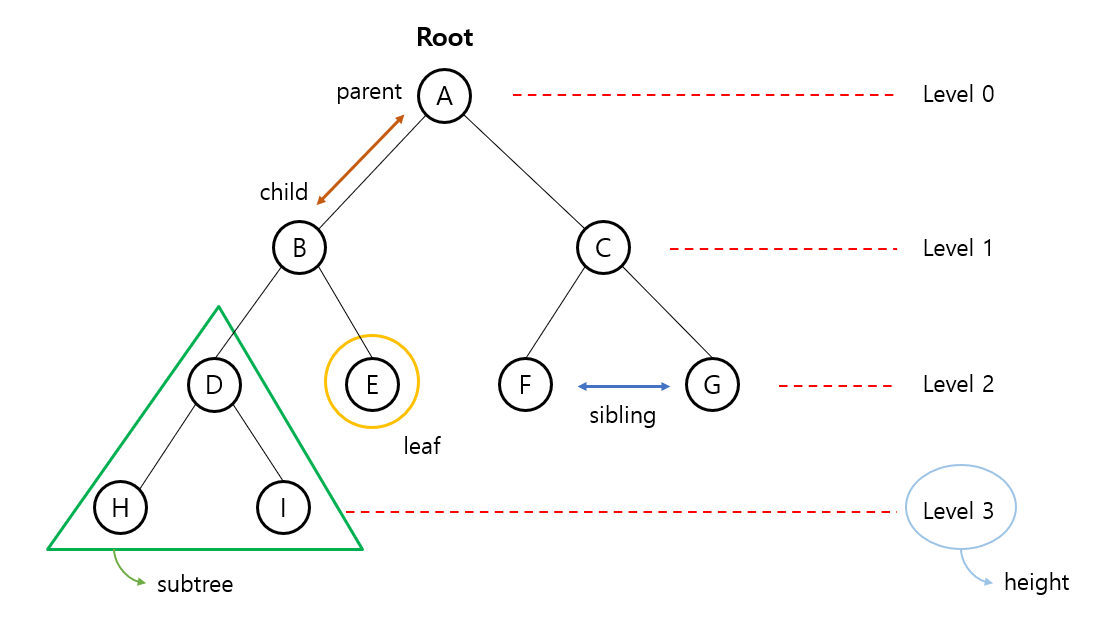 - 레벨 level : 뿌리(0 level)부터 시작하여 경로가 증가할 때마다 늘어남