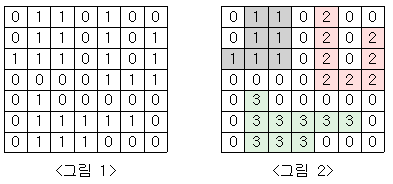 <그림 1>과 같이 정사각형 모양의 지도가 있다. 1은 집이 있는 곳을, 0은 집이 없는 곳을 나타낸다. 철수는 이 지도를 가지고 연결된 집들의 모임인 단지를 정의하고, 단지에 번호를 붙이려 한다.