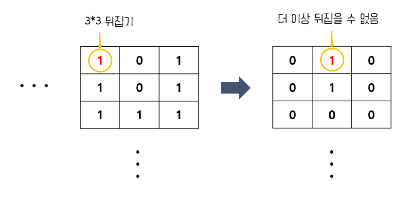 해당 좌표부터 3*3만큼의 크기가 나오지 않는다면 뒤집을 수 없기 때문이다. 해당 좌표는 더이상 뒤집을 수 없기 때문에 이 좌표의 값을 검사하여 1이면 "-1"을 출력하고 종료, 0이라면 pass한다(line 61~ line 66). 아래의 그림을 참고하자.