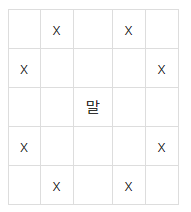 같은 이동 방식을 가진다. 다음 그림에 말의 이동 방법이 나타나 있다. x 표시한 곳으로 말이 갈 수 있다는 뜻이다. 참고로 말은 장애물을 뛰어넘을 수 있다.